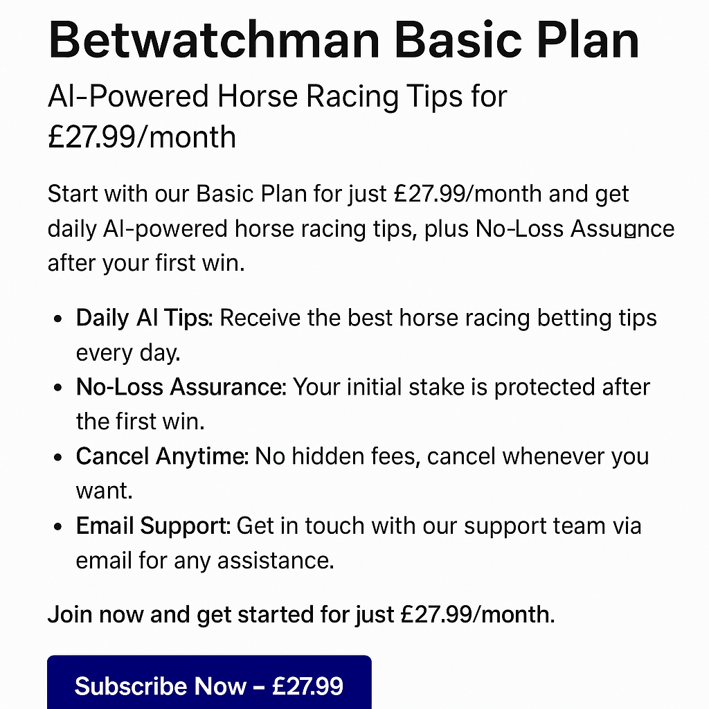 Start with our Basic Plan for just £27/month and get daily AI-powered horse racing tips, plus No-Loss Assurance after your first win.